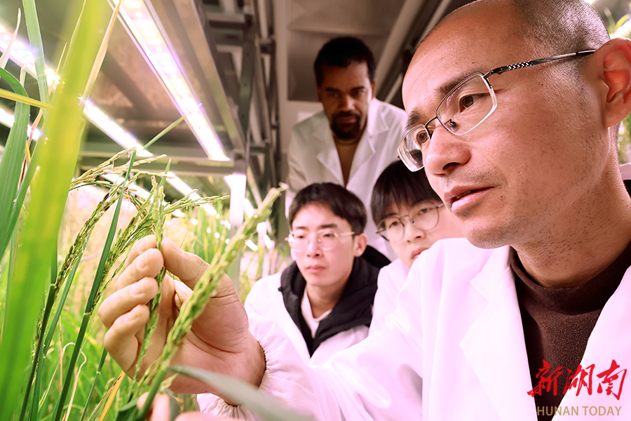 3月23日,湖南岳麓山实验室,靳云凯(右一)教授带领学生在人工气候室观察稻穗生长情况。湖南农业大学靳云凯教授带领团队历经十年攻关,在全球率先培育出甲烷减排70%且增产20%的水稻新品种,目前即将进入大田推广阶段。 湖南日报全媒体记者 赵持 通讯员青晓彤 摄影报道