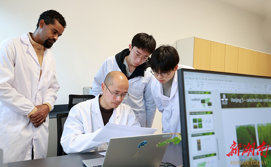 3月23日,湖南岳麓山实验室,靳云凯教授团队在分析水稻生长与甲烷排放数据。湖南农业大学靳云凯教授带领团队历经十年攻关,在全球率先培育出甲烷减排70%且增产20%的水稻新品种,目前即将进入大田推广阶段。 湖南日报全媒体记者 赵持 通讯员青晓彤 摄影报道