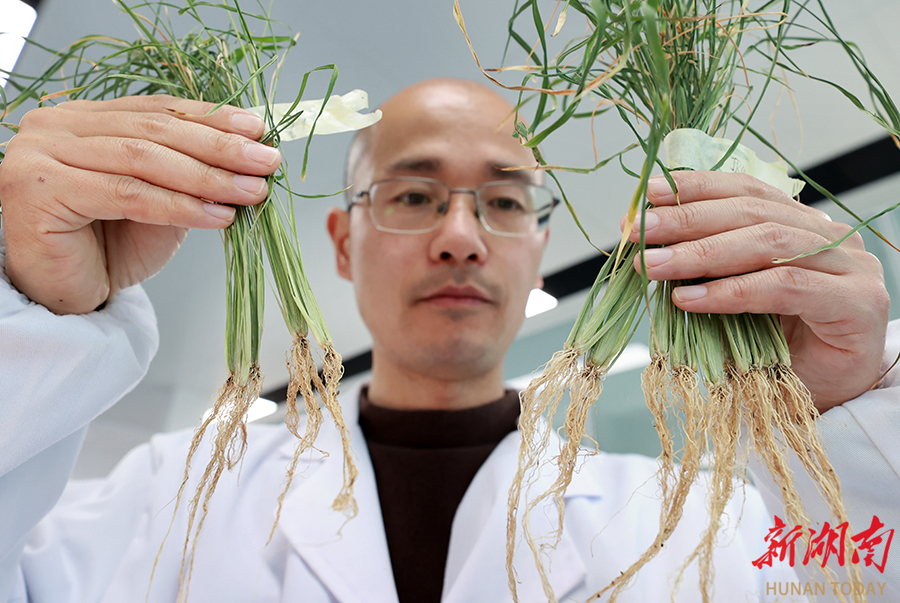 3月23日,湖南岳麓山实验室,靳云凯教授在比对水稻根系样本。湖南农业大学靳云凯教授带领团队历经十年攻关,在全球率先培育出甲烷减排70%且增产20%的水稻新品种,目前即将进入大田推广阶段。 湖南日报全媒体记者 赵持 通讯员青晓彤 摄影报道