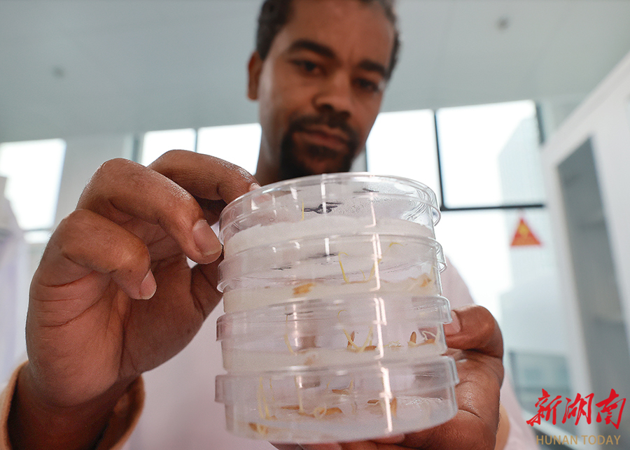 3月23日,湖南岳麓山实验室,来自埃塞俄比亚的留学生博士GENETI TAKELE ZIKE在展示不同批次的水稻发芽样本。湖南农业大学靳云凯教授带领团队历经十年攻关,在全球率先培育出甲烷减排70%且增产20%的水稻新品种,目前即将进入大田推广阶段。 湖南日报全媒体记者 赵持 通讯员青晓彤 摄影报道