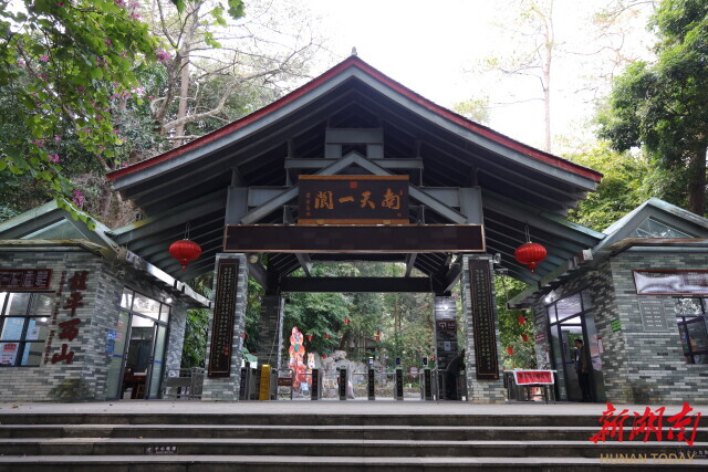 行至西山新山门,“南天一阆”四个大字在晨光中骤然醒目,一副褐底金书的楹联悬挂于新山门两侧,在青灰石砖的映衬下,泛着岁月沉淀的光泽: