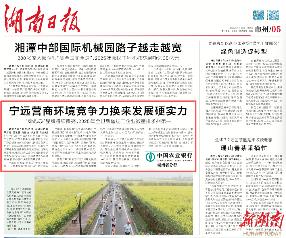 营商环境好,发展底气足。2025年,宁远地区生产总值增速位居永州第二,新增规工企业数量排全市第一,锂电池产业集群规模位列永州第一;签约引进投资5000万元以上项目45个、合同引资80亿元;“校友回湘”招商引资、招才引智成果分别进入全省10强和20强。