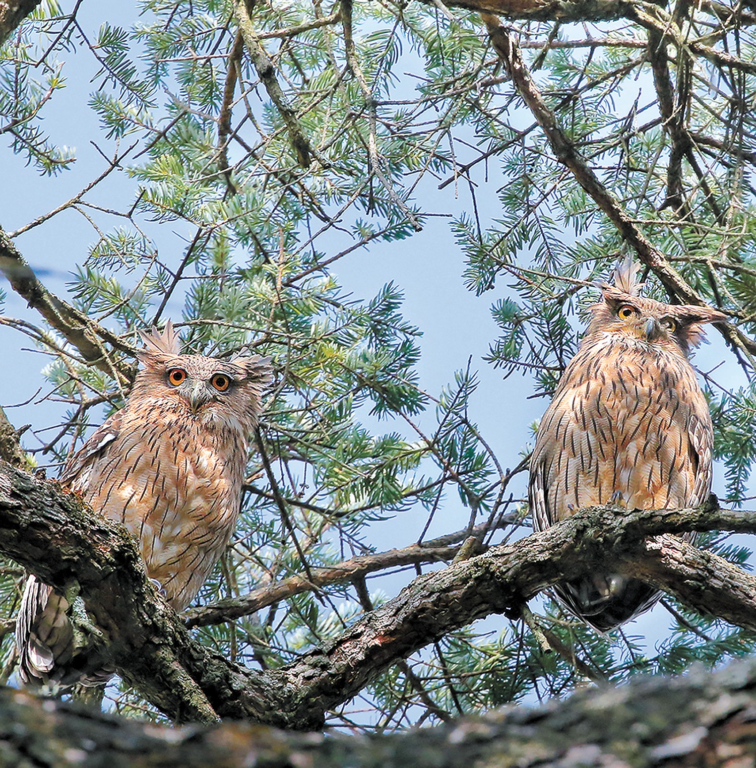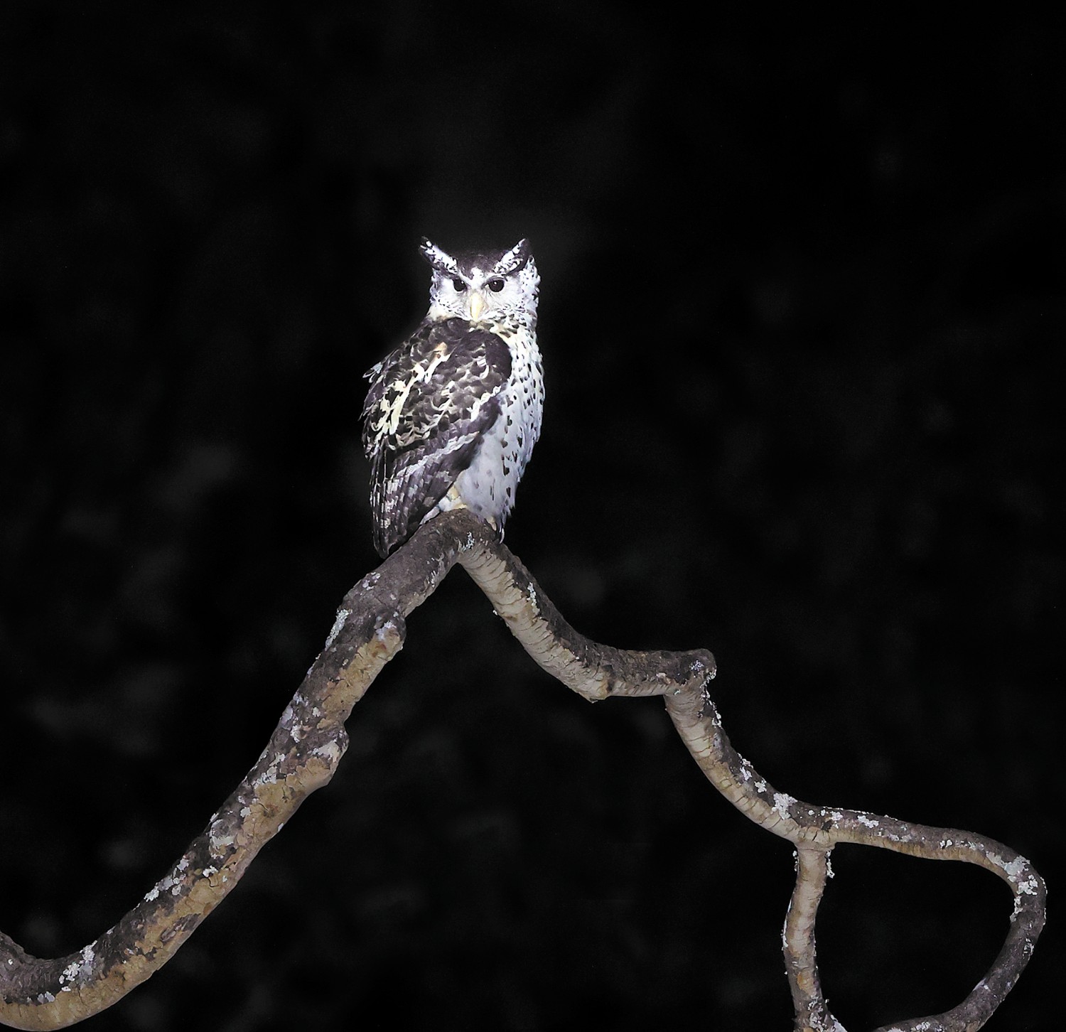 林雕鸮,“树冠巨鸟”,大型猛禽,体长70厘米左右,翼展可达1.5米,羽色黑白相间,黑褐色与皮黄色交织,威风凛凛