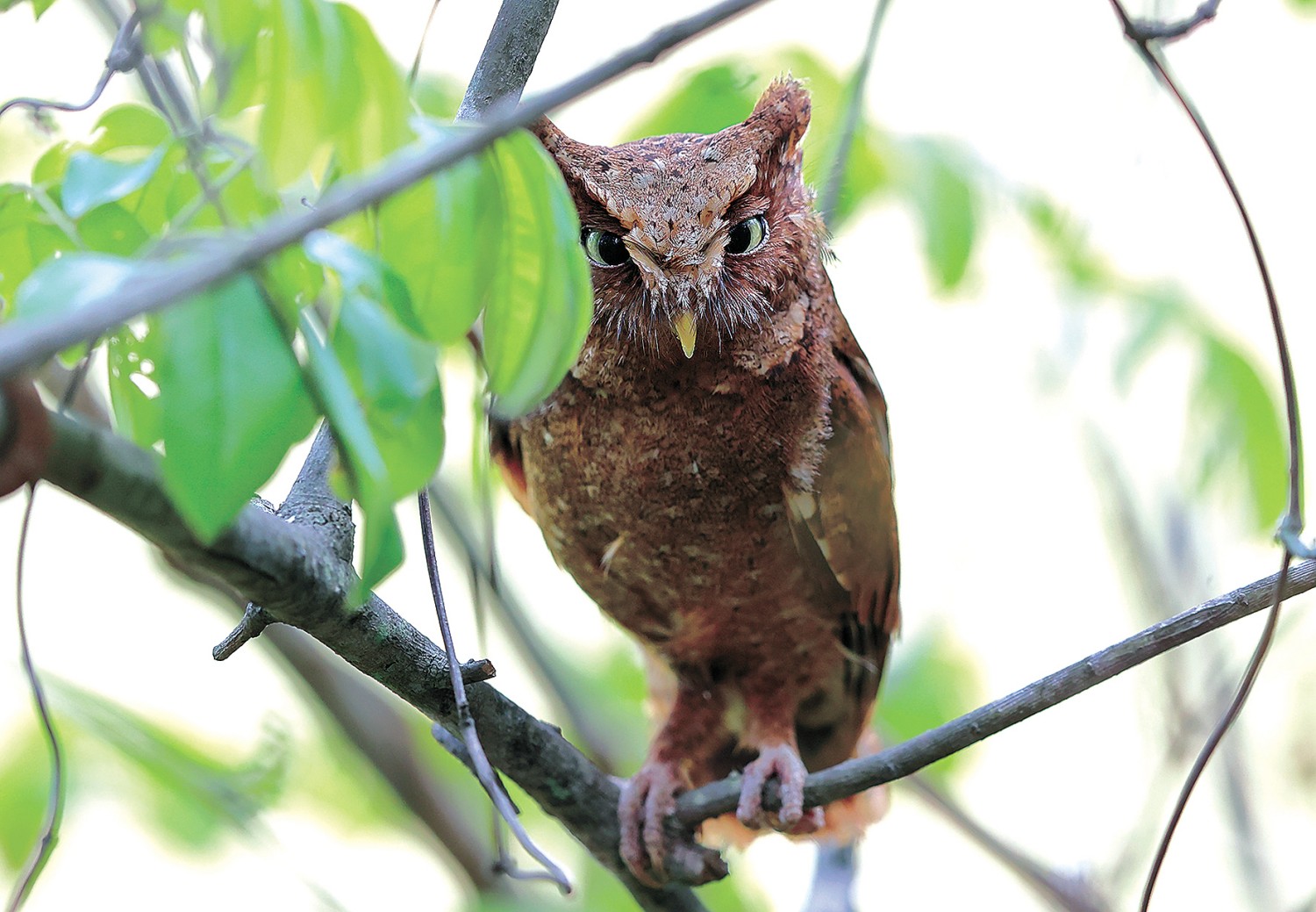 栗鸮,“雨林精灵”,小型猛禽,通体覆盖栗红色羽毛伴有芝麻黑点,面盘呈心形,眼周点缀着白色绒毛,偏爱普洱、西双版纳的热带雨林