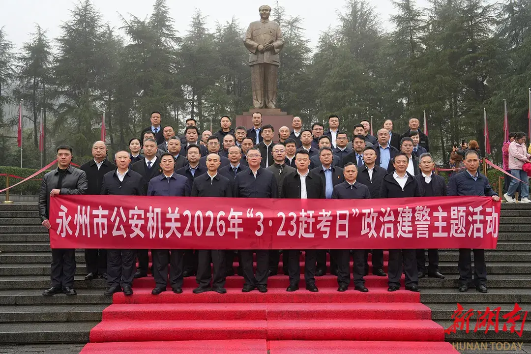 今年是党中央从西柏坡出发“进京赶考”77周年。3月23日,永州市公安机关在伟人故里韶山举行“3·23赶考日”政治建警主题活动,开展树立和践行正确政绩观学习教育,深切缅怀毛泽东同志的丰功伟绩,以“赶考”的清醒与坚定,感悟“为有牺牲多壮志,敢教日月换新天”的革命精神,从中汲取信仰养分和前行力量,为高水平推进全市公安工作现代化凝聚磅礴力量。