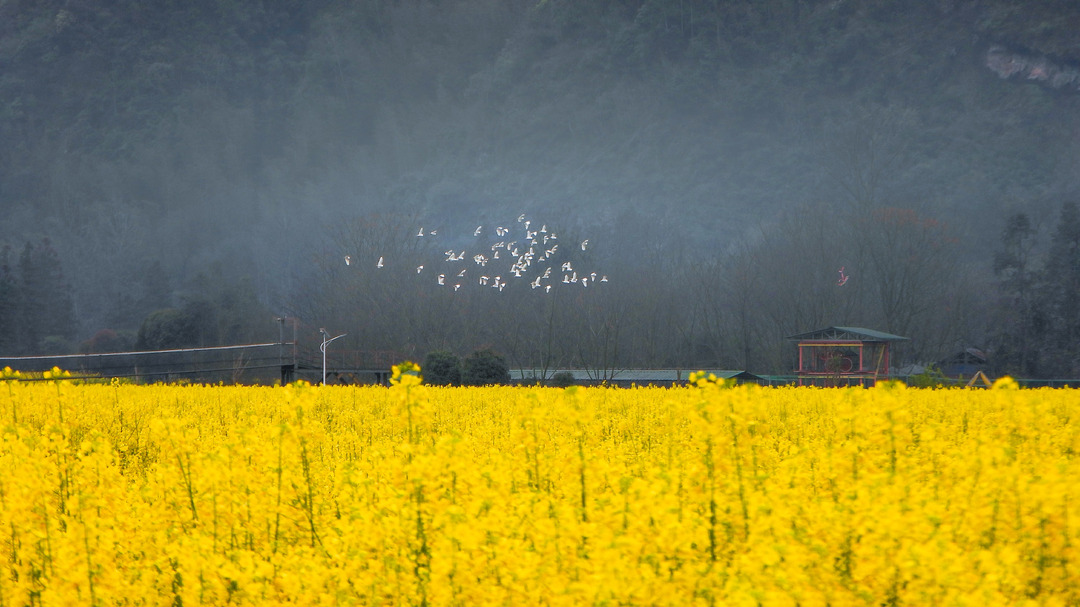 通道侗族自治县万佛山镇,一群鹭鸟展翅翱翔,穿梭于金黄的油菜花海上空。尹序平 摄(湖南图片库)