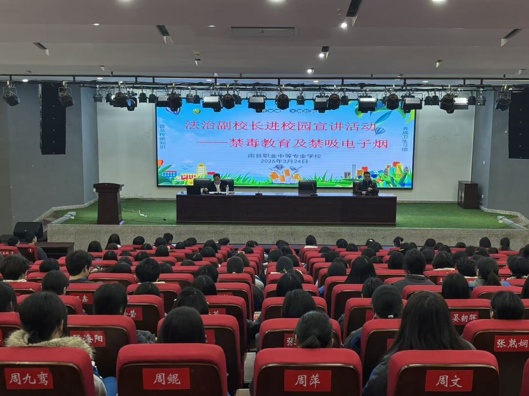 3月24日上午,南县职业中等专业学校开展禁毒法治进校园活动。湖南跃海律师事务所张军武律师以法治副校长身份走进校园,围绕禁毒教育与禁吸电子烟主题,为师生带来一堂生动的宣讲课。
