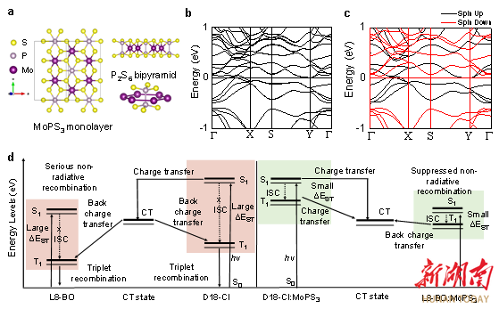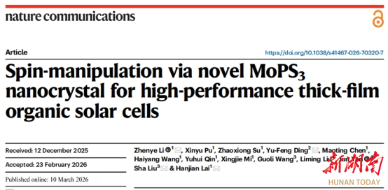 湖南日报·新湖南客户端3月24日讯(通讯员 伍资姿)近日,南华大学李振业教授团队在Nature Communications(《自然-通讯》)发表重要研究成果,创新性地提出了一种基于自旋调控的激子动力学优化策略,通过开发新型二维铁磁MoPS3纳米晶,在活性层内自发形成弱内禀磁场并通过重原子效应增强自旋-轨道耦合,显著促进单重态激子向长寿命三重态激子的系间窜越过程,延长了激子扩散长度,并抑制了非辐射复合损失,最终实现厚膜有机太阳能电池光伏性能的显著增强,对推动有机太阳电池实现大规模卷应用具有重要的科学价值。李振业教授为论文第一作者及通讯作者,南华大学机械工程学院为论文第一署名单位。