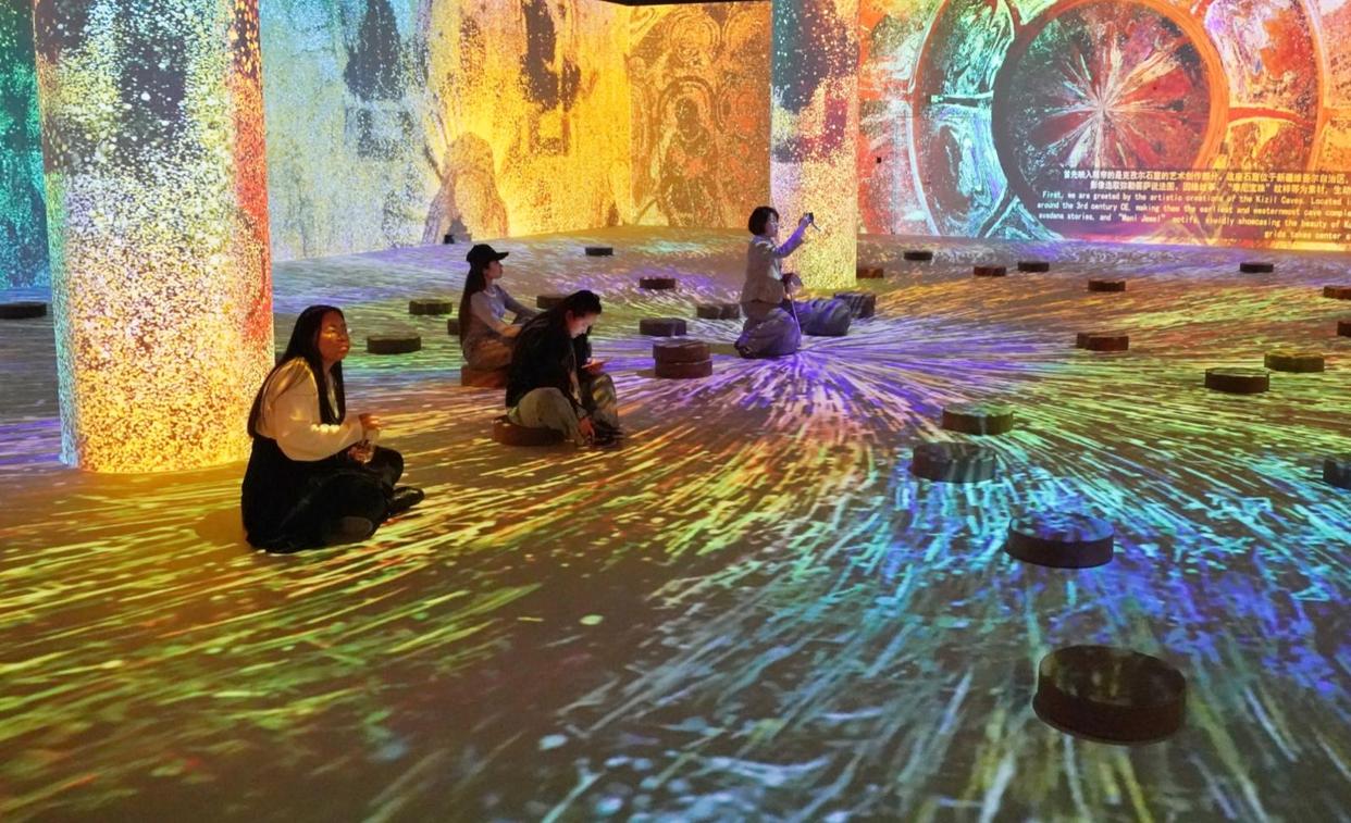 顺着扶梯下到B2层,《华彩万象——石窟艺术沉浸体验展》就在这一层的05展厅。步入厅内,宛若进入光影的幻境中,在数字建模、AI算法、数字交互等技术的加持下,克孜尔石窟、敦煌莫高窟、麦积山石窟、云冈石窟和龙门石窟五个典型石窟逐一登场,石窟里的壁画、造像、碑刻等历史遗存通过数字化艺术再创作的形式呈现,绚烂异常。