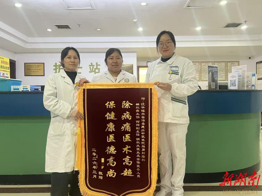新湖南客户端3月24日讯(通讯员 盘林凤)近日,63岁的何先生将一面印有“除病痛医术高超 保健康医德高尚”的锦旗送到江华瑶族自治县民族中医医院脾胃肿瘤科,感谢医院不仅治好了他的病,还主动帮扶他解决生活与就医难题。