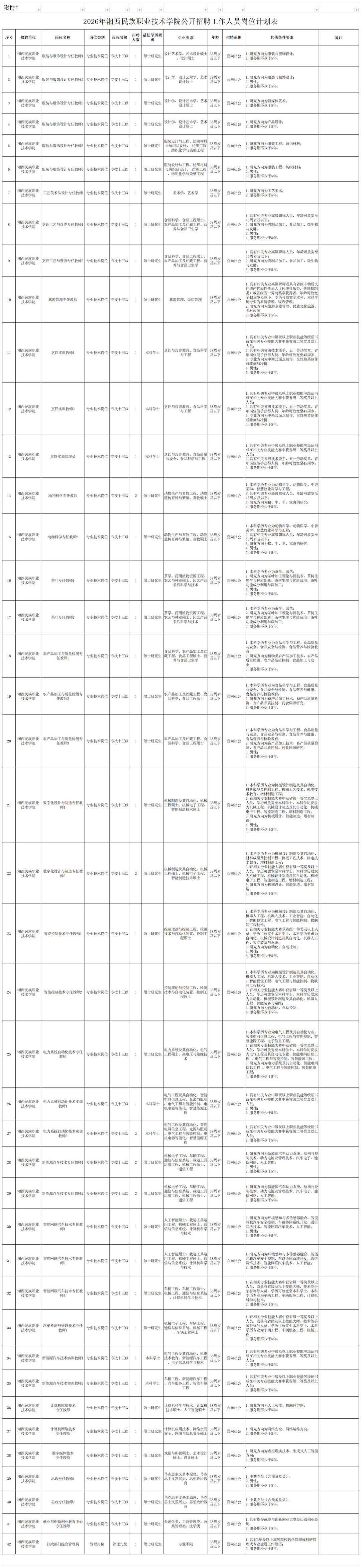 详见《2026年湘西民族职业技术学院公开招聘工作人员岗位计划表》(附件1)。