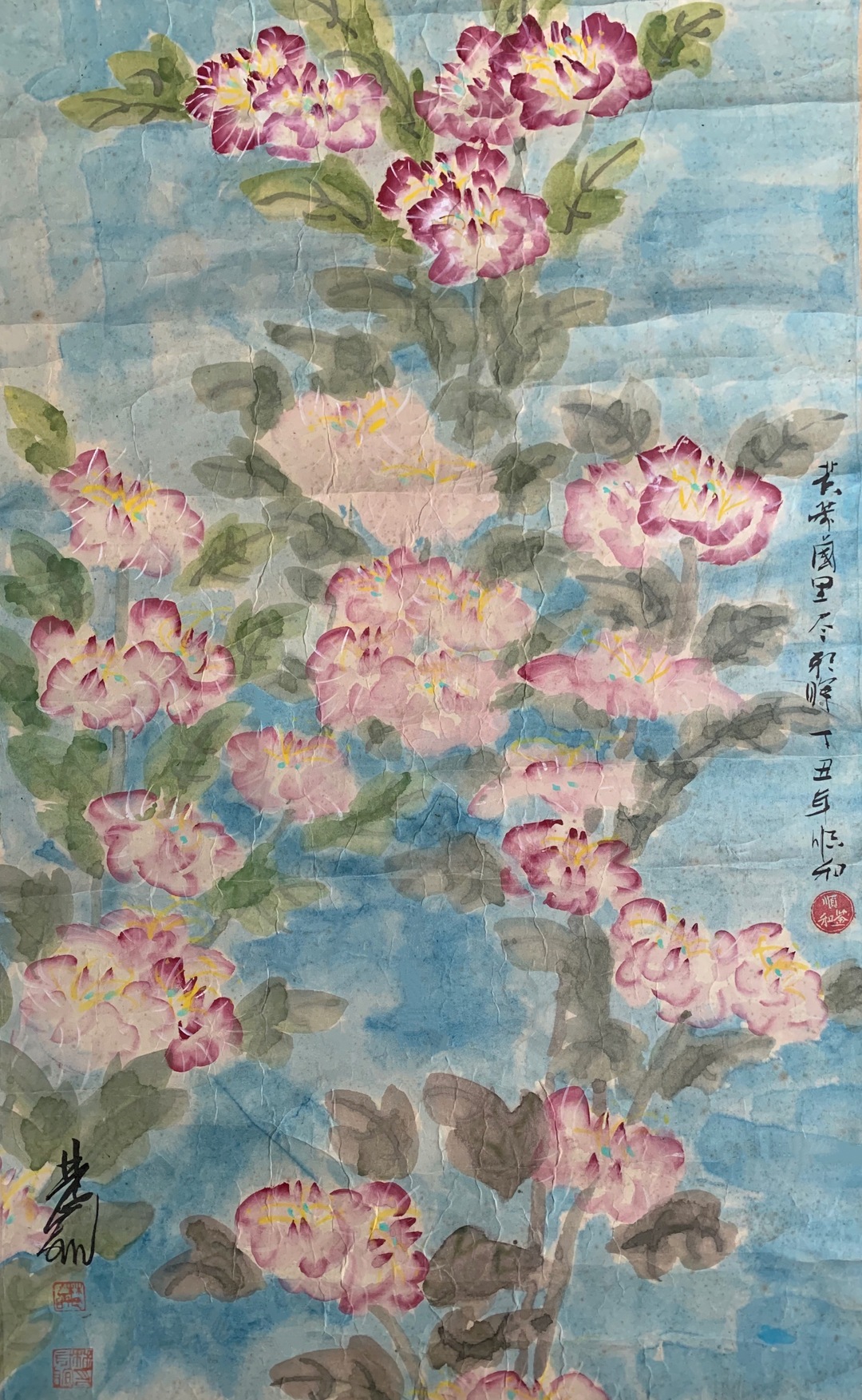 林风眠在长沙逗留的时间不长,由于战火日益逼近,杭州国立艺专在长沙招收了一批新生后,不得不再次踏上迁徙之路。对此,艺专老师刘开渠的夫人程丽娜回忆道:“到了长沙,艺专的去向成了问题。林风眠校长便到武汉教育部请示,结果是:到湘西沅陵与北平艺专合并,改名国立艺专,并成立3人小组的校务委员会:林风眠为主任委员,赵太侔、常书鸿为委员;还任命了教务长和各系主任。雕塑系主任仍为刘开渠。”于是,“1938年4月间,学校奉部令离长沙雇舟经洞庭湖先至常德再经桃源至沅陵。”由此可见,林风眠在长沙实际上只待了短短的三四个月时间。这期间,他不仅要忙于安顿学校、办理招生等事宜,而且还抽空去了一趟武汉。所以,林风眠在长沙几乎没有时间搞创作,他留下的作品自然也就少之又少。这幅落款时间为丁丑年的芙蓉花,是我见到的唯一一张林风眠创作于长沙的绘画,可以看作是他对长沙这座古老历史名城的赞誉,亦可以看作是他在国破家亡的危难时刻,为山河立传、重塑文化自信的一种努力。