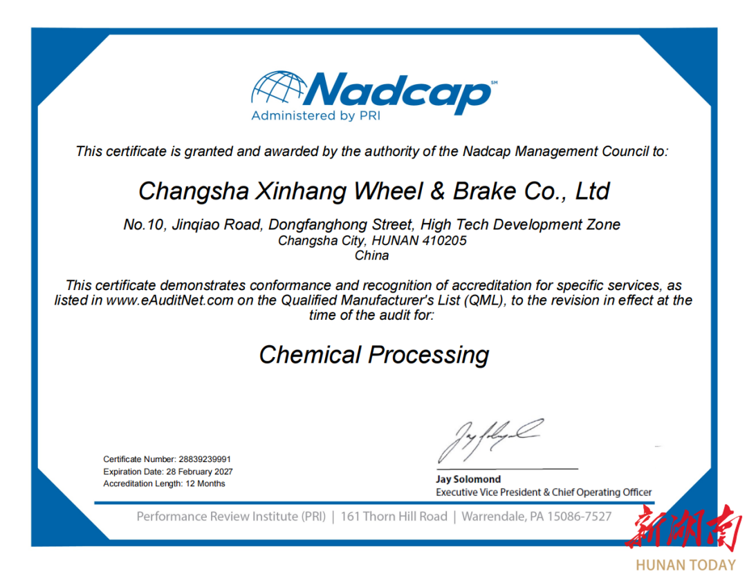 新湖南客户端3月24日讯(通讯员 杨改航)近日,兴湘集团旗下长沙鑫航机轮刹车有限公司(以下简称“长沙鑫航”)顺利通过Nadcap(国家航空航天和国防合同方授信项目)化学处理(CP)特种工艺认证。这是继2025年长沙鑫航取得Nadcap无损检测(NDT)认证后,特种工艺能力再次获得国际权威认可,标志着该公司在航空航天领域表面处理技术及质量管控体系达到国际先进标准。