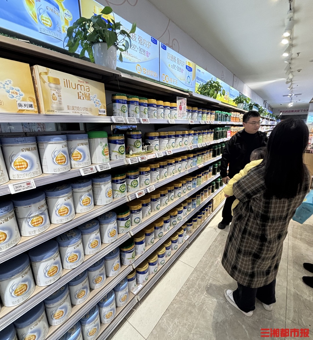 3月23日,记者在长沙泊富国际广场“孩子王”门店看到,店内满墙陈列着美赞臣、爱他美、飞鹤等多个品牌的婴幼儿奶粉,不同年龄段的进口和国产奶粉一应俱全,一对夫妻正带着孩子选购奶粉。