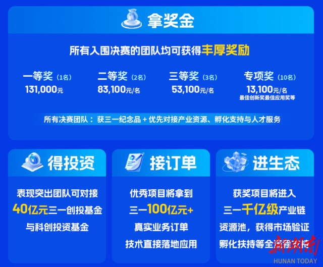 真实业务落地:获奖项目将有机会承接三一集团超百亿元真实业务订单,推动技术快速落地应用。