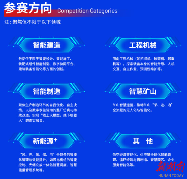 大赛面向高校、科研院所、初创企业及社会团队开放报名,鼓励跨学科、跨领域组队参赛。参赛方向包括但不限于:智能建造、工程机械智能化升级、智能制造虚实融合、智慧矿山无人化运营、新能源全链条智慧管理等。同时也欢迎低空经济、智慧园区、循环经济等新兴领域的创新项目参与。