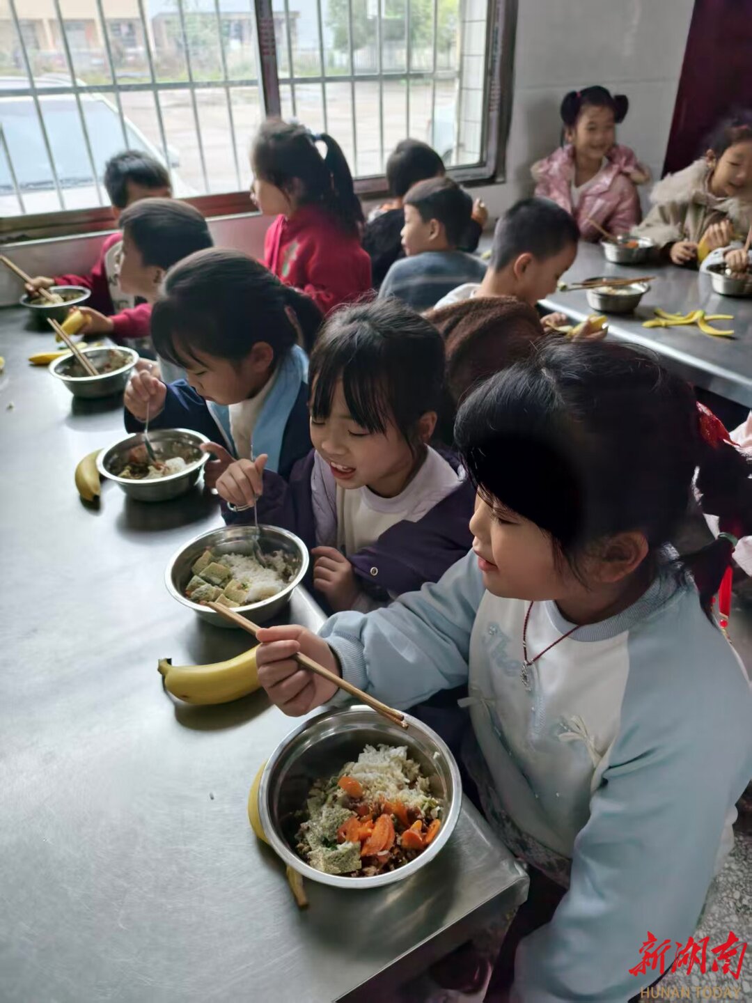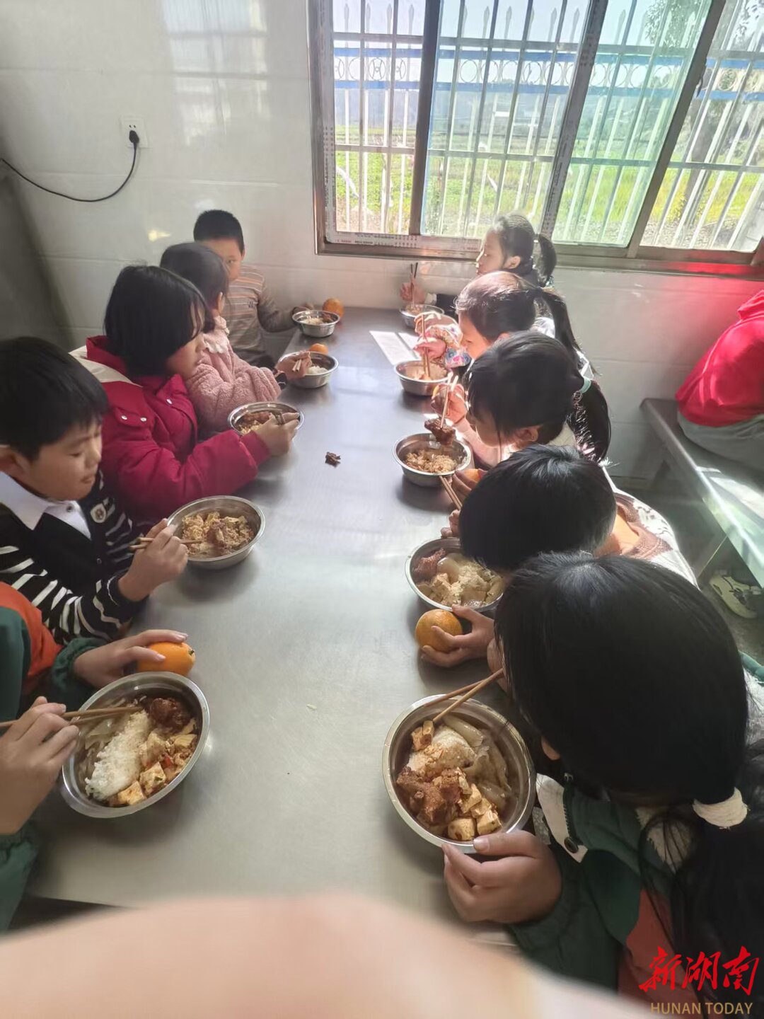 湖南日报·新湖南客户端3月24日讯(记者 陈鸿飞 通讯员 邹健 王冬胜 陈曙霞 摄影 洪晓燕)“学校的饭菜,和妈妈做的一样好吃。”3月24日午餐时分,衡阳县岣嵝乡神皇小学餐厅飘出阵阵饭菜香。五年级的何双四姐弟端着碗,找了个就餐位坐下。今天的菜是辣椒炒肉、素炒白菜,还有一份三鲜汤,餐桌上还摆着四个苹果,四姐弟吃得津津有味。