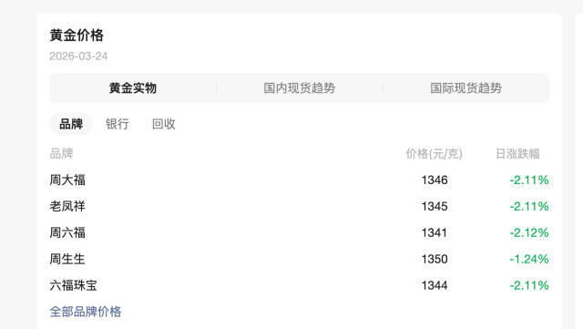 3月24日,国内品牌金饰价格继续回落。周大福足金饰品报价1346元/克,单日下跌29元,工艺金章金条类报1180元/克。
