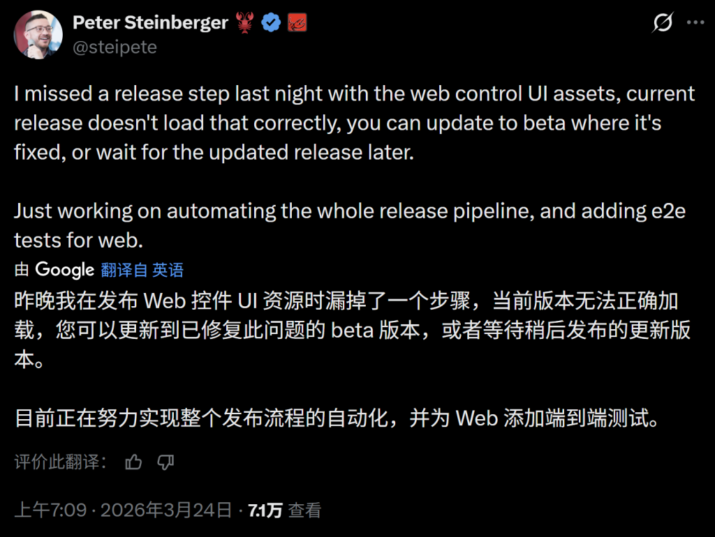 首先,在发布本次升级时,由于控制台没有被打包到新版本中,导致用户在升级后无法打开控制台。OpenClaw的创始人彼得·斯坦伯格(Peter Steinberger)迅速出来“背锅”,数小时后,OpenClaw又紧急发布了3.23版本更新,修复了这一严重问题。