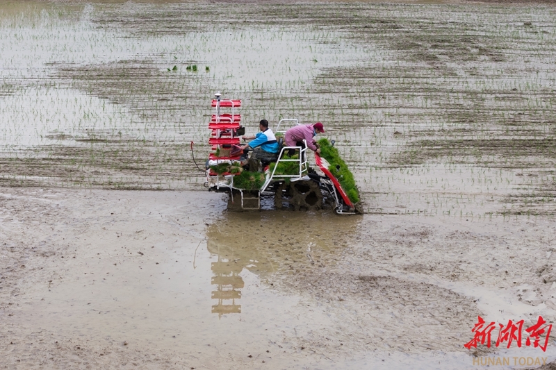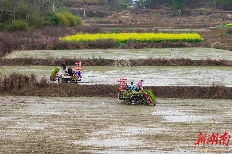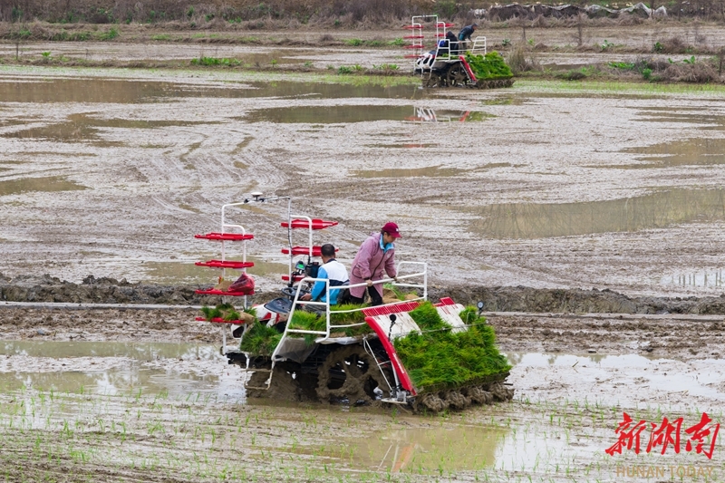 3月24日,永州市冷水滩区杨村甸乡陡角头村,农民驾驶插秧机移栽早稻秧苗。春耕时节,当地科学调配农机设备,加快推进早稻插秧作业,确保粮食稳产增收。雷中祥 蒋凌志 摄影报道(湖南图片库)