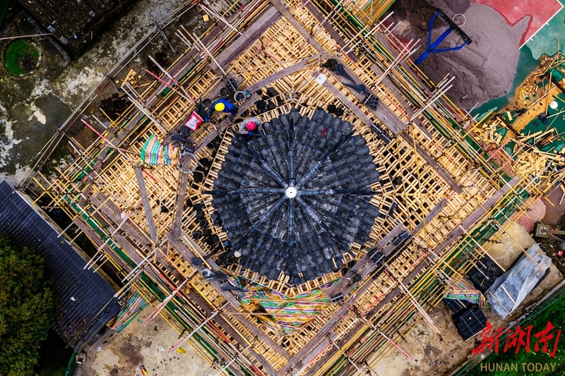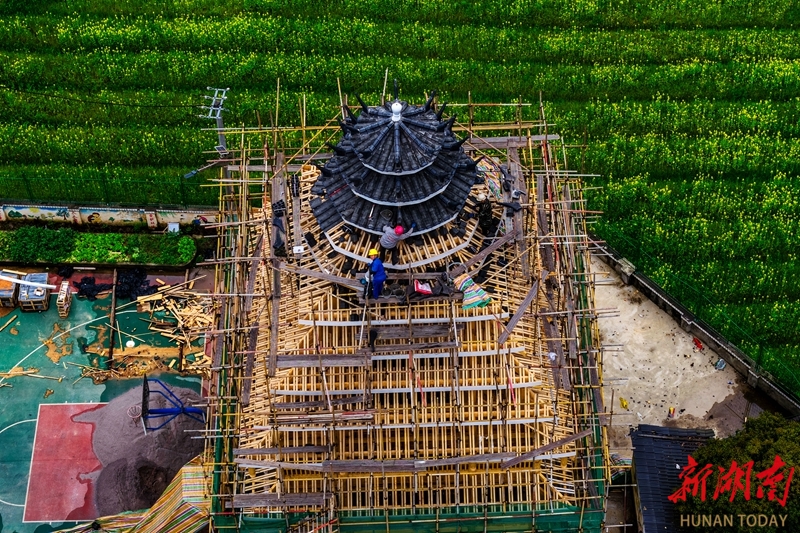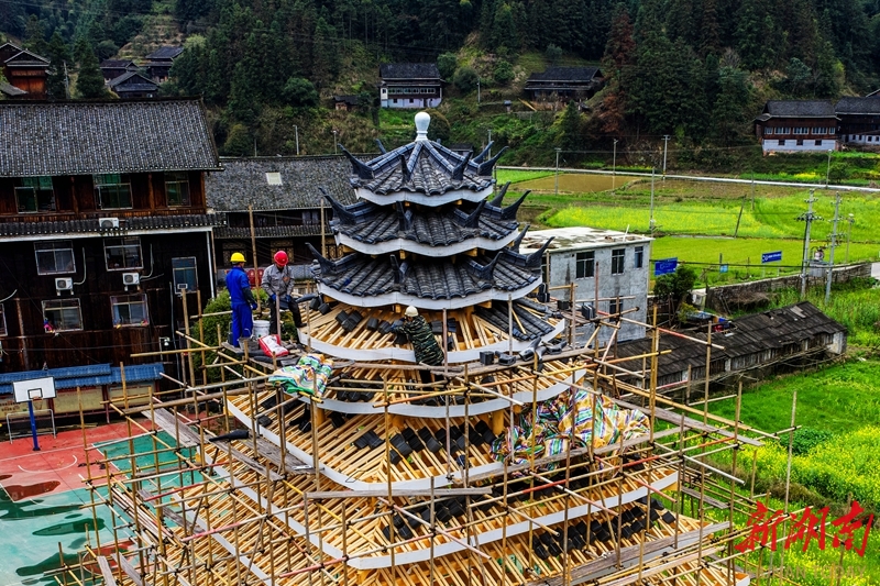 3月24日,通道侗族自治县双江镇芋头村,工匠在修建侗族鼓楼。鼓楼作为侗族村寨的标志性建筑,建成后将为村民提供集会、议事、文化娱乐的公共活动场所,进一步完善乡村文化服务设施。石猛雷 摄(湖南图片库)