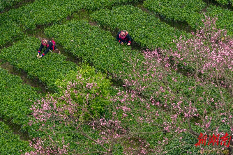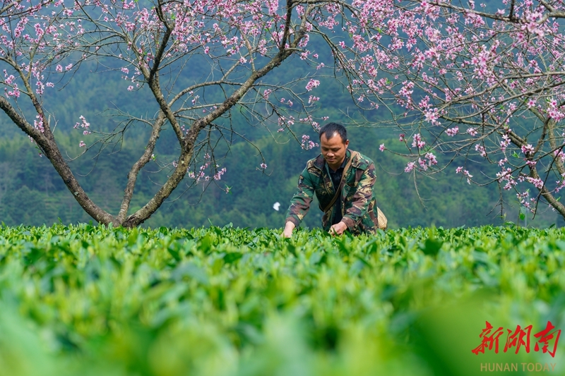 3月24日,宜章县莽山瑶族乡永安村茶园,村民正抢抓农时采摘春茶。近年来,当地依托良好生态资源发展茶产业,有效促进农民增收。邓加亮 摄(湖南图片库)