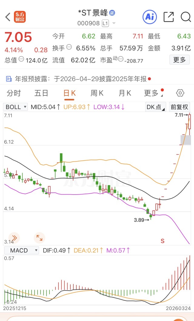 进入3月,*ST景峰的股价就像踩足了油门,一字板、T字板轮番登场,即便盘中偶尔开板,也能被资金快速回封,市场做多情绪直接拉满。截至3月24日收盘,公司股价站稳7.05元/股,13个交易日内区间涨幅惊人,远超ST板块平均水平,股吧里股民讨论热度居高不下,有人踏空直呼可惜,有人持仓坐等收益,俨然成了资本市场的焦点。