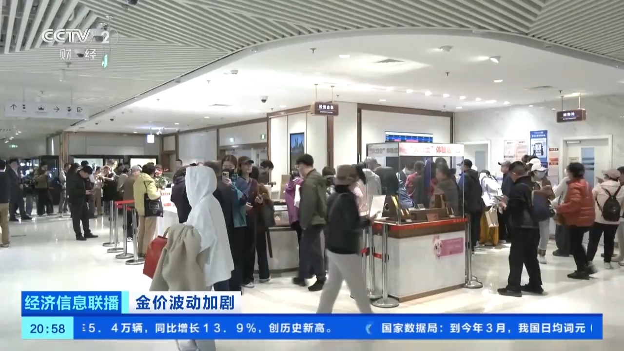 总台央视记者 王闻聪:在北京市西城区的一家金店,工作日的下午4时,这里的消费者络绎不绝,有不少消费者在现场关注实时的黄金价格,准备随时入手。在现场,购买黄金投资产品的消费者要多于购买黄金饰品的消费者。这周的客流量比上周增长了30%左右。