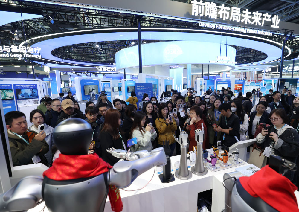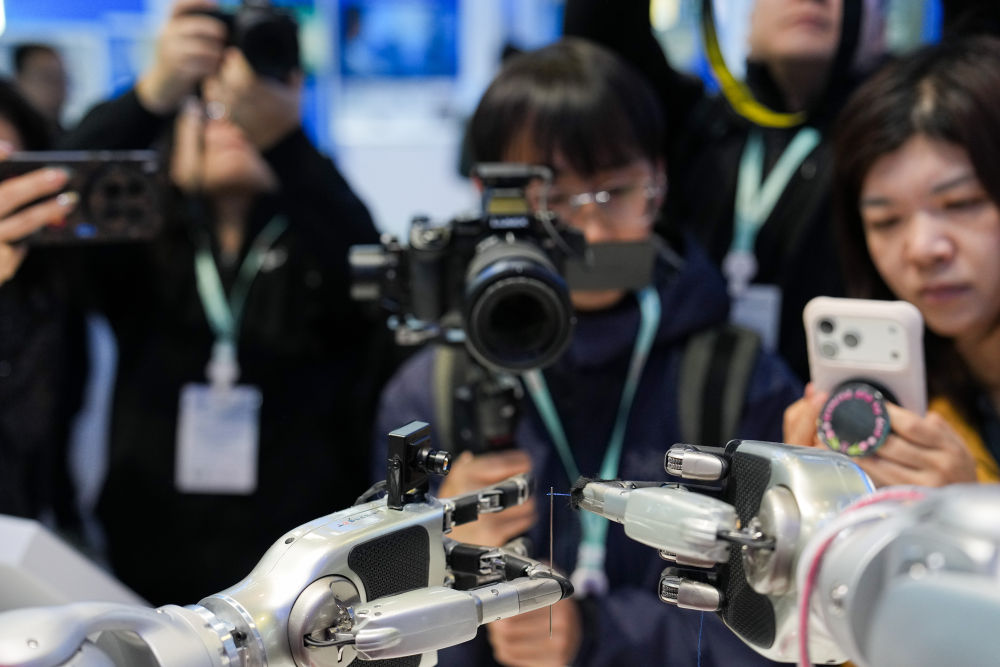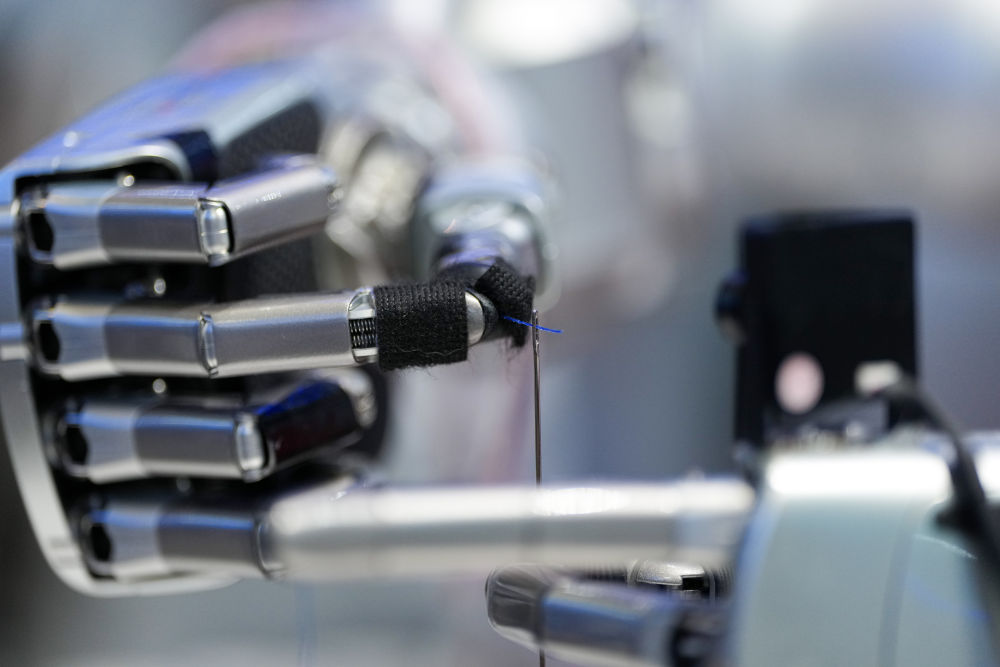 ↑ 3月24日,在中关村展示中心常设展上,一台配备了灵巧手的机器人在展示穿针引线。