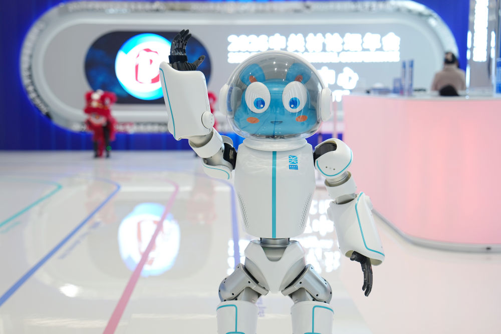 ↑ 3月24日,在中关村论坛年会新闻中心内,一台机器人向观众招手。