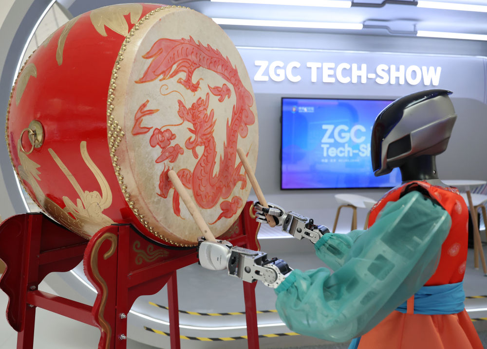 ↑ 3月24日,在中关村国际创新中心,机器人乐队与舞蹈机器人在表演。