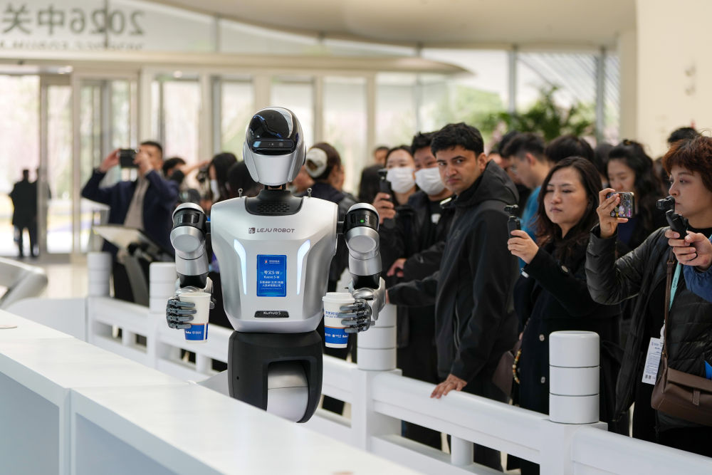 ↑ 3月24日,在中关村国际创新中心的机器人餐吧,机器人在端送饮品。