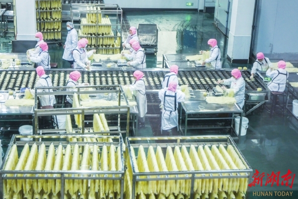 3月24日,娄底市新化高新区湖南丰谷食品科技股份有限公司生产车间,员工在加紧生产米粉。近年来,新化县推动米粉产业从初加工向精深加工转型,形成了以米粉为核心的特色食品产业体系。