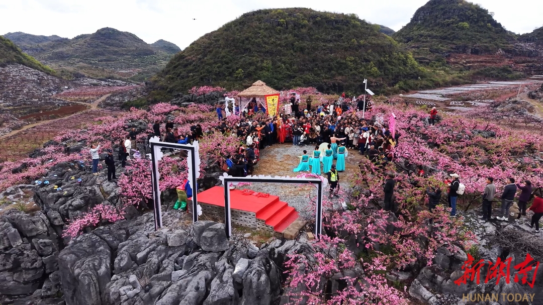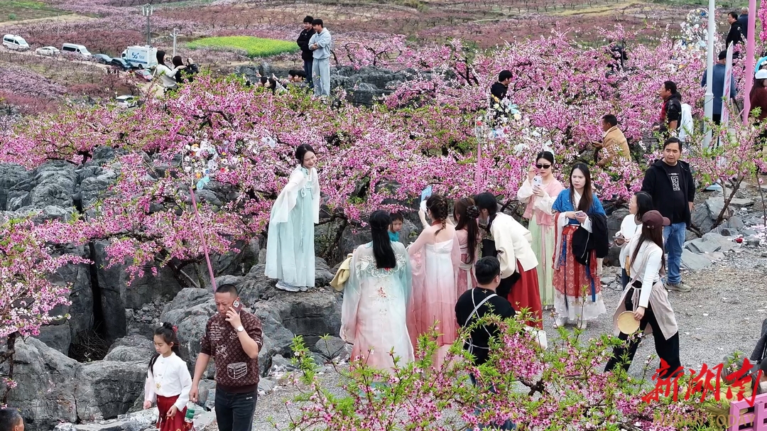 春满潇湘,永州市江永县兰溪瑶族乡香花井村的喀斯特石山上,近万亩桃花竞相绽放,粉嫩花枝从石缝中舒展蔓延,将昔日石漠荒山染成浪漫花海。独有的“石上生花”美景引八方游客慕名而来,瑶乡百姓在石头缝里蹚出产业兴、百姓富的乡村振兴路,让贫瘠石山变成了名副其实的“金山银山”。