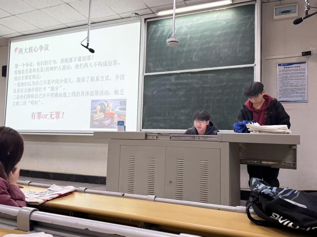 活动现场,汇报人结合蒋某等四人出借银行卡参与“跑分”的真实案件,从案情引入、法律分析、法庭争议焦点、反思与警示四大模块展开讲解,将“帮信罪”的犯罪构成、司法认定逻辑、量刑标准等专业知识,转化为通俗易懂的内容。通过拆解“只帮忙没动手也可能构成犯罪”“‘不知情’难成免责借口”等核心争议点,让师生清晰认识到出借银行卡、参与“跑分”等行为背后的法律陷阱,在以案释法中认清非法金融套路、提升风险防范能力。大家还通过分享研讨心得,让防非反诈理念从课堂向校园生活延伸。