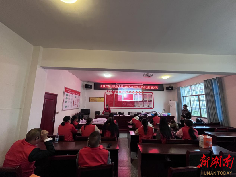 金塘安置点是常宁市重点易地搬迁安置区,居民专业技能缺乏,稳定增收能力较弱,是巩固脱贫攻坚成果的重点和难点。常宁市人社局联合社区与本地职业培训机构,瞄准家政服务业市场需求大、入门门槛相对较低的特点,探索出“家门口培训+家门口招聘”的闭环就业帮扶模式。