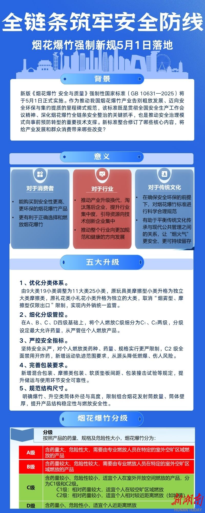 新版《烟花爆竹 安全与质量》强制性国家标准(GB 10631—2025)将于5月1日正式实施。作为推动我国烟花爆竹产业告别粗放发展、迈向安全环保与集约提质的里程碑式规范,该标准既是贯彻全国安全生产工作会议精神、深化烟花爆竹全链条安全整治的关键抓手,也是推动安全治理模式向事前预防转型的重要技术支撑。新标准整合修订了哪些核心内容,将给产业发展和群众消费带来哪些改变?记者近日采访湖南烟花爆竹产品安全质量监督检测中心副主任朱玉平,为大家带来权威解读。