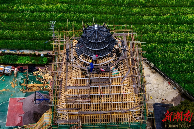 On March 24, craftsmen began constructing a Dong ethnic drum tower at Yutou Village, Shuangjiang Town, Tongdao Dong Autonomous County. As an iconic structure of Dong villages, the drum tower will, once completed, serve as a public venue for villagers to hold gatherings and meetings, and engage in cultural and recreational activities, thereby further enhancing rural cultural facilities. (Photo/Shi Menglei)