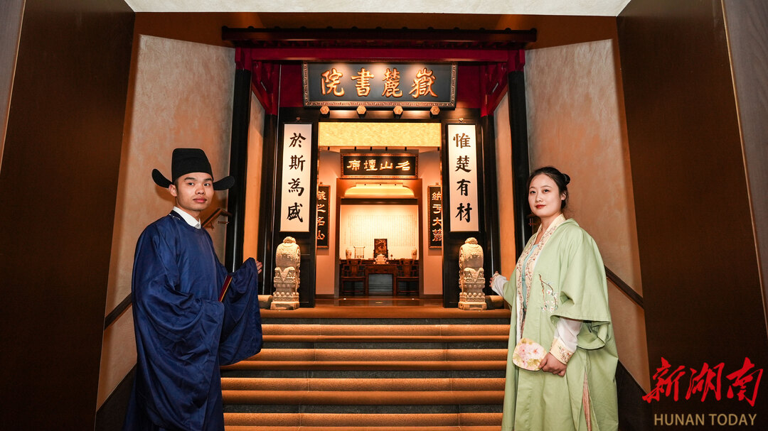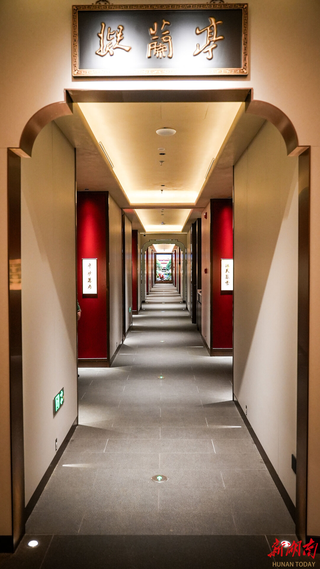 北京北五环外,联想、小米等科技巨头的总部大厦鳞次栉比。在这片充满现代感的科技园区中,一栋挂着“潇湘府”牌匾、门头以镀铜不锈钢延伸出大气屋檐的建筑,显得有些特别。推门而入,长沙岳麓书院大门和讲堂被1:1复刻于眼前,“潇湘夜雨”“平沙落雁”等古今潇湘十六景化作包间主题……