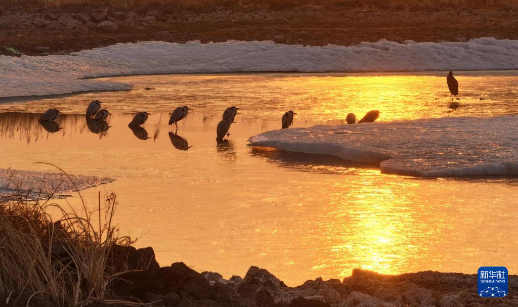 3月21日,候鸟在黑龙江省牡丹江市宁安市一处水域休憩(无人机照片)。新华社发(王宝勋摄)