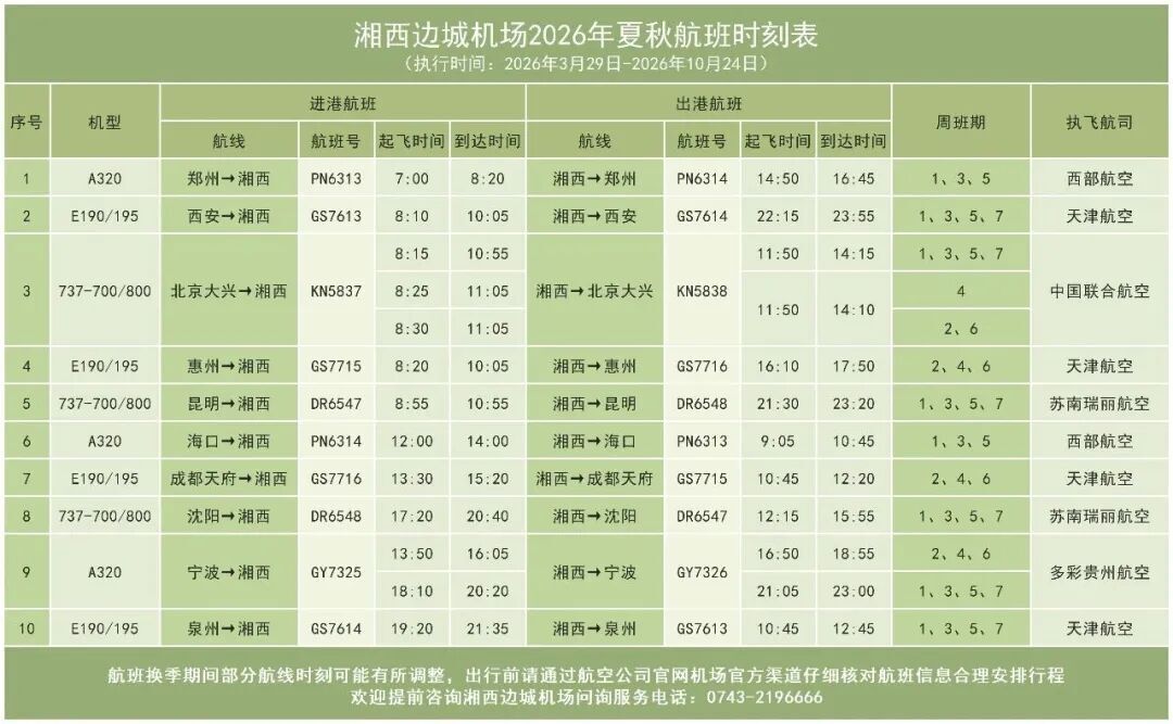 湖南日报·新湖南客户端3月25日讯(全媒体记者 郭朵朵)3月29日起,全国民航正式进入2026年夏秋航季,该航季将持续210天,至10月24日结束。湘西边城机场同步完成航线焕新,6条航线覆盖北京、成都、西安、郑州、宁波、沈阳、泉州、昆明、惠州、海口10座城市,实现京津冀、长三角、西南、西北等国内重点区域的高效通达,构建起干支结合、覆盖广泛的航线运行格局。