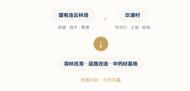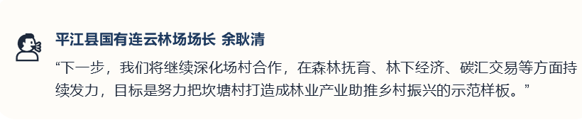 暮色中的坎塘村,山林苍翠,炊烟袅袅。黄厚发从林场收工回家,口袋里装着当天的工资。“以前这林子是‘死’的,现在是‘活’的了。”他笑着说,眼里满是对未来的期待。这或许就是“场村合作”最深层的魅力——让专业的人做专业的事,让林农安心当“股东”,让每一片山林都成为乡村振兴的绿色引擎。