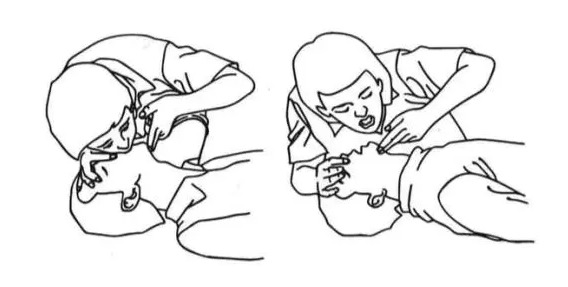 ●将患者下颌抬起,头部后仰,开通气道。每做30次胸外心脏按压,交替进行2次人工呼吸。