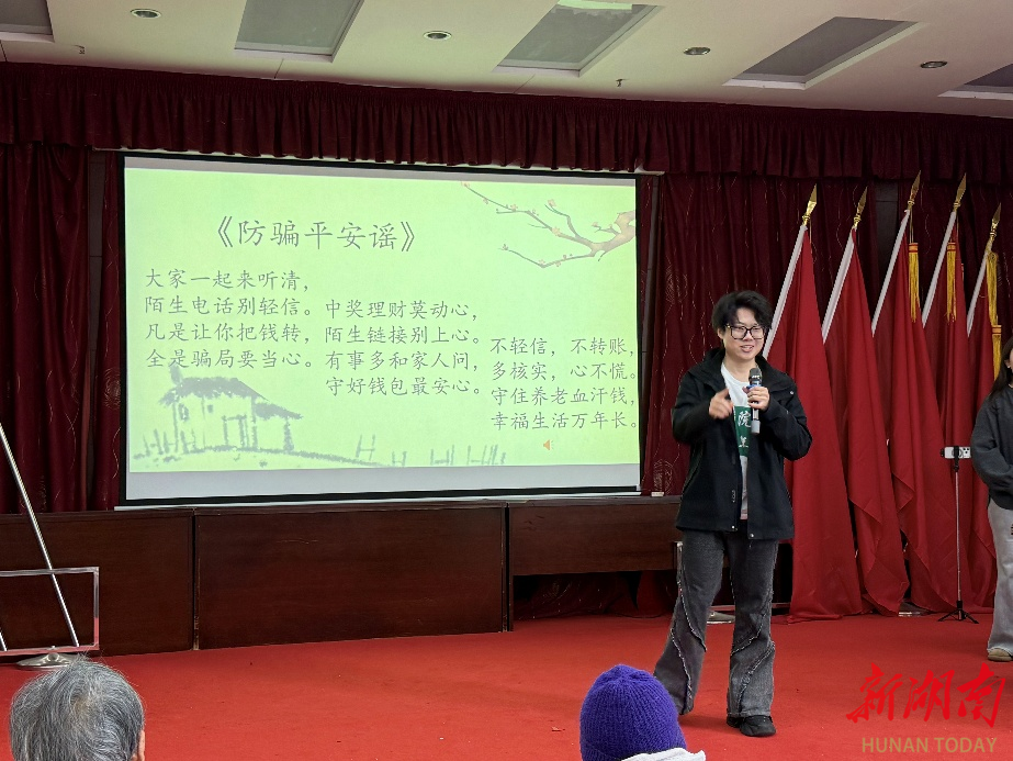 节目间隙,互动环节温情上线。许安珍、黎瑶老师带来《桃花朵朵开》互动课堂,以轻松有趣的形式引导老人们参与其中,欢声笑语不断,让现场氛围持续升温。紧接着,团队全体成员合唱经典曲目《浏阳河》,熟悉的乡土旋律唤起了老人们的共同记忆,也将演出推向了高潮。演出尾声,肖嘉尧老师以原创作品《防骗平安谣》收尾,创新采用歌谣教学的形式科普反诈知识,在温情陪伴中为老人们送上实用的安全守护,与整场演出“暖老、护老”的理念高度契合,赢得了老人们的一致称赞。