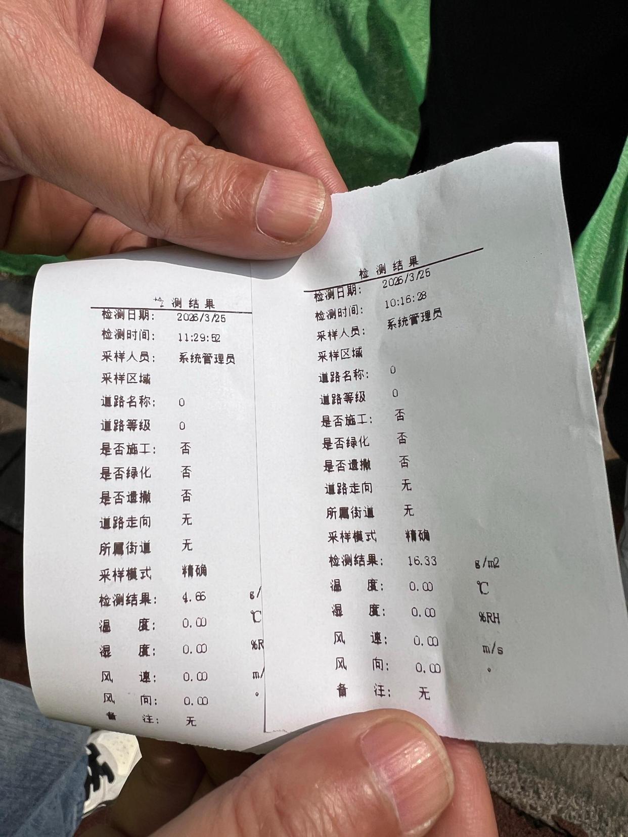 为了检验洗地实效,一辆尘土残存量检测车来到南河沿大街,对洗地效果进行现场实测。在对同一路面洗地前后分别进行检测后,检测车很快打印出了检测结果。洗地前,南河沿大街每平方米的尘土残存量数值为16.33克;而洗地作业后,这一数值直接下降到了4.66克。