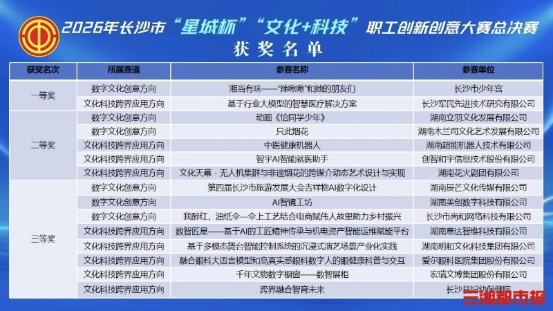 三湘都市报·新湖南客户端3月25日讯(全媒体记者 王智芳 通讯员 阙胜瑶)3月24日,长沙市总工会举办2026年长沙市“星城杯”“文化+科技”职工创新创意大赛总决赛。