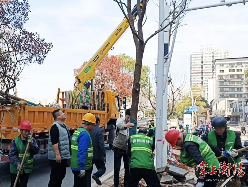 截至3月24日,东风路、湘江东路、衡州大道、蒸阳南路、蒸湘北路等城市主干道上,已补栽樟树、栾树、桂花树等行道树150余株、新添红叶石楠、红檵木等花灌木球83株;营盘山公园、岳屏广场补植了常青藤、麦冬等地被植物500平方米。