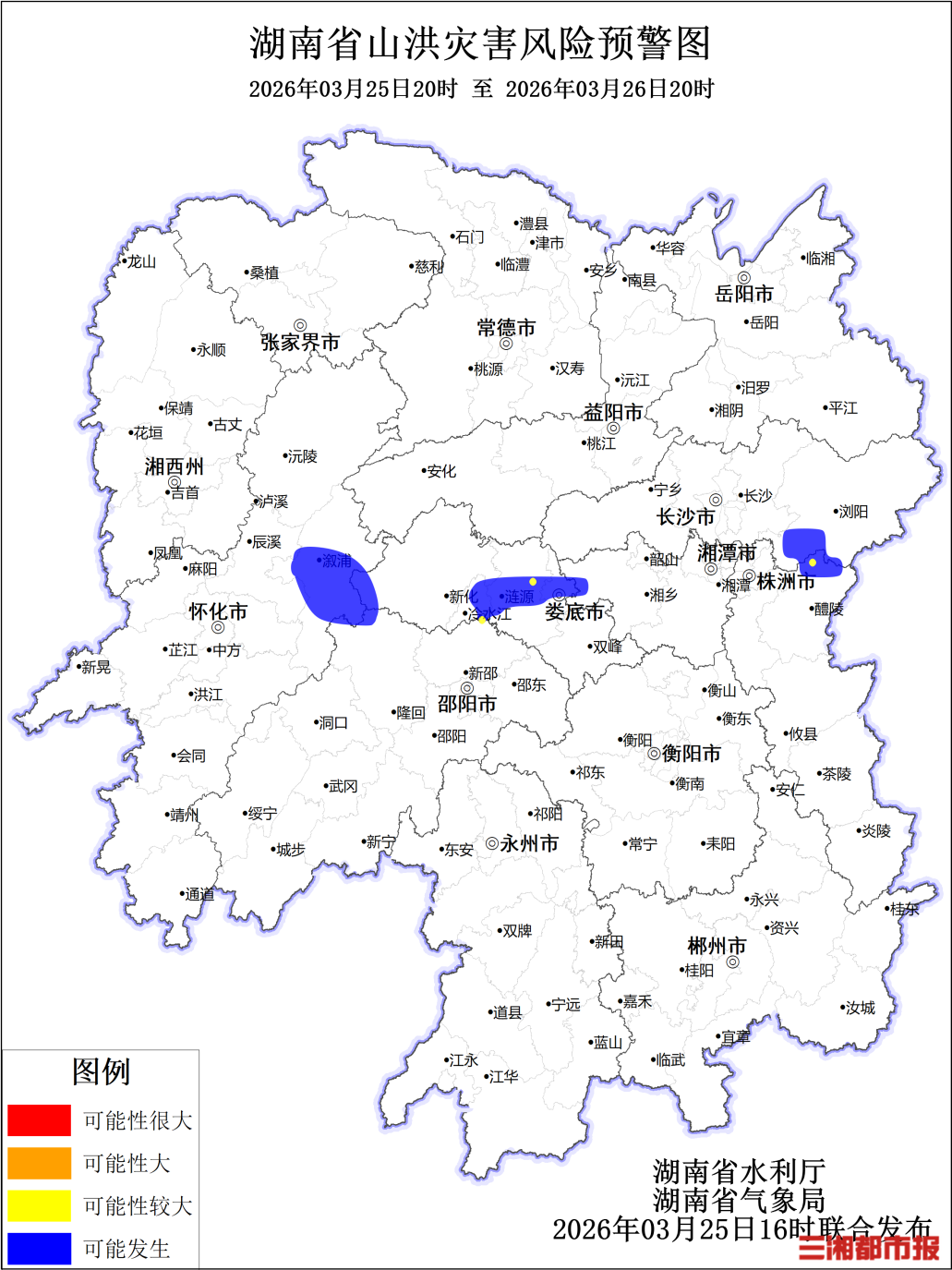 三湘都市报·新湖南客户端3月25日讯(全媒体记者 李致远)根据省气象局3月25日预报,省水利厅与省气象局联合会商得出如下结论:受降雨影响,25日20:00至26日20:00,邵阳市、娄底市、株洲市、长沙市、湘潭市、怀化市等局地可能发生山洪灾害。