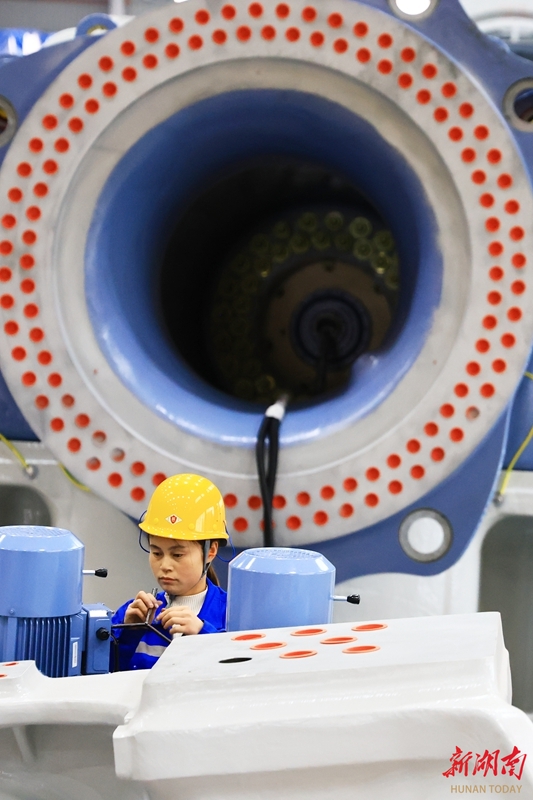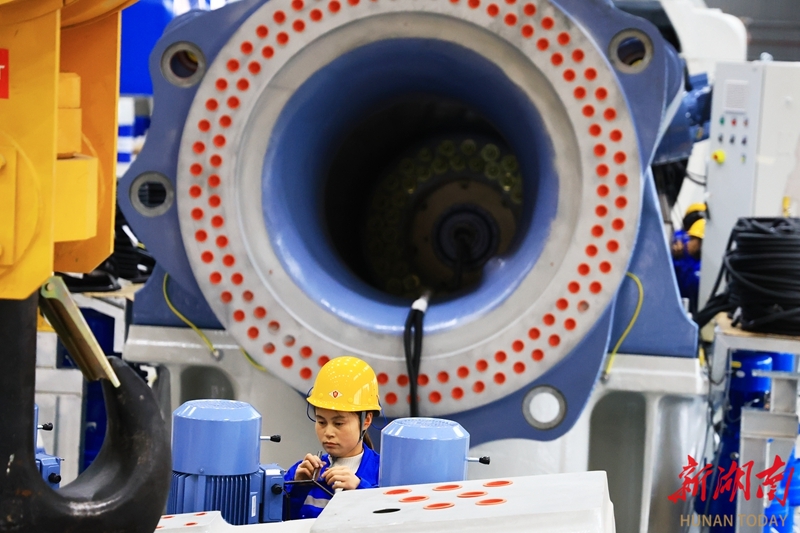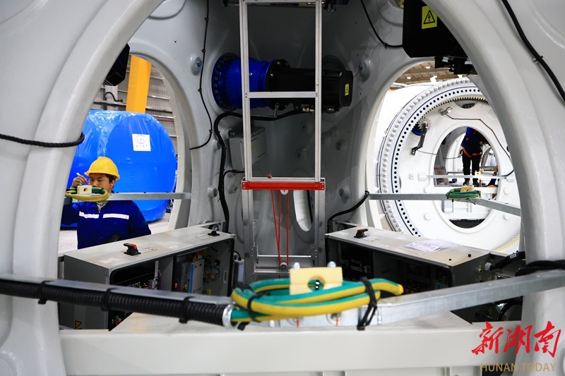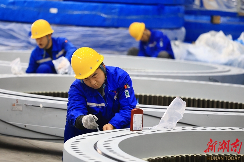 3月25日,怀化高新区鹤城片区怀化东方风电新能源有限公司生产车间,工人正在加紧生产。该公司专注研发生产5至8兆瓦大功率陆上风电机组,特别适用于南方山地风场,具备年产300台套、200万千瓦风电主机设备能力,可实现年产值20亿元。近年来,鹤城片区大力引进新能源产业,形成发电、无人设备、储能等科技公司集群发展,实现经济与社会效益双赢。柴均林 摄(湖南图片库)