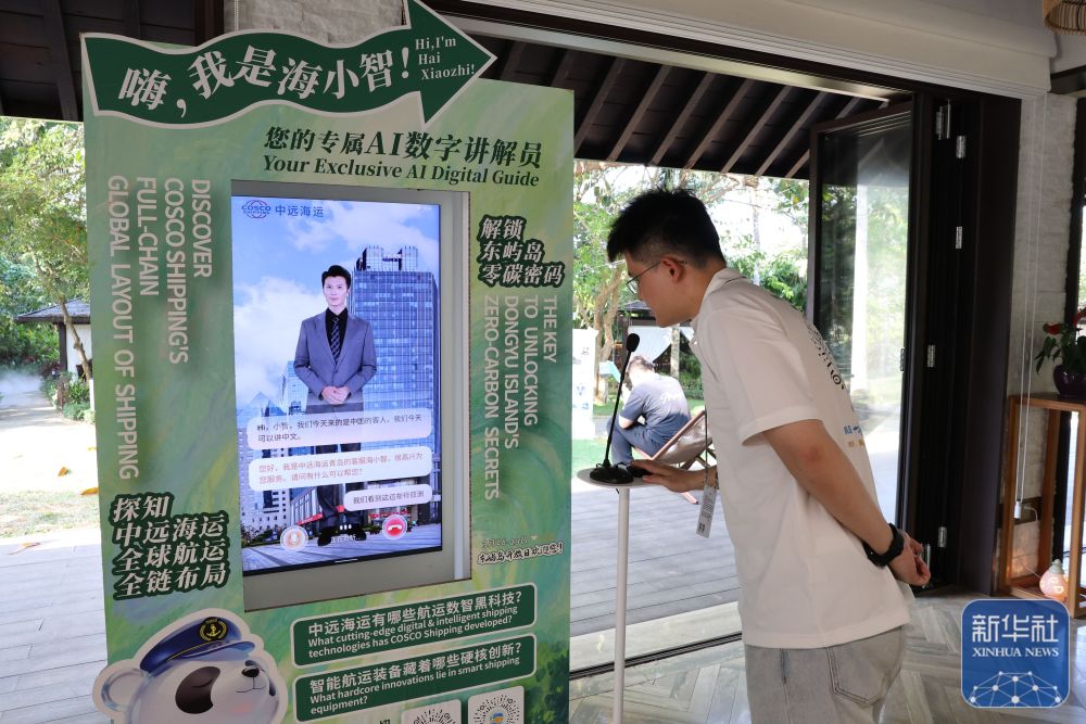 ↑ 3月25日,工作人员在博鳌亚洲论坛年会会场与AI数字讲解员对话。